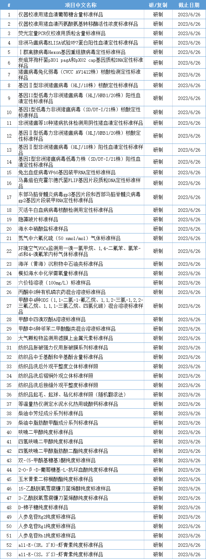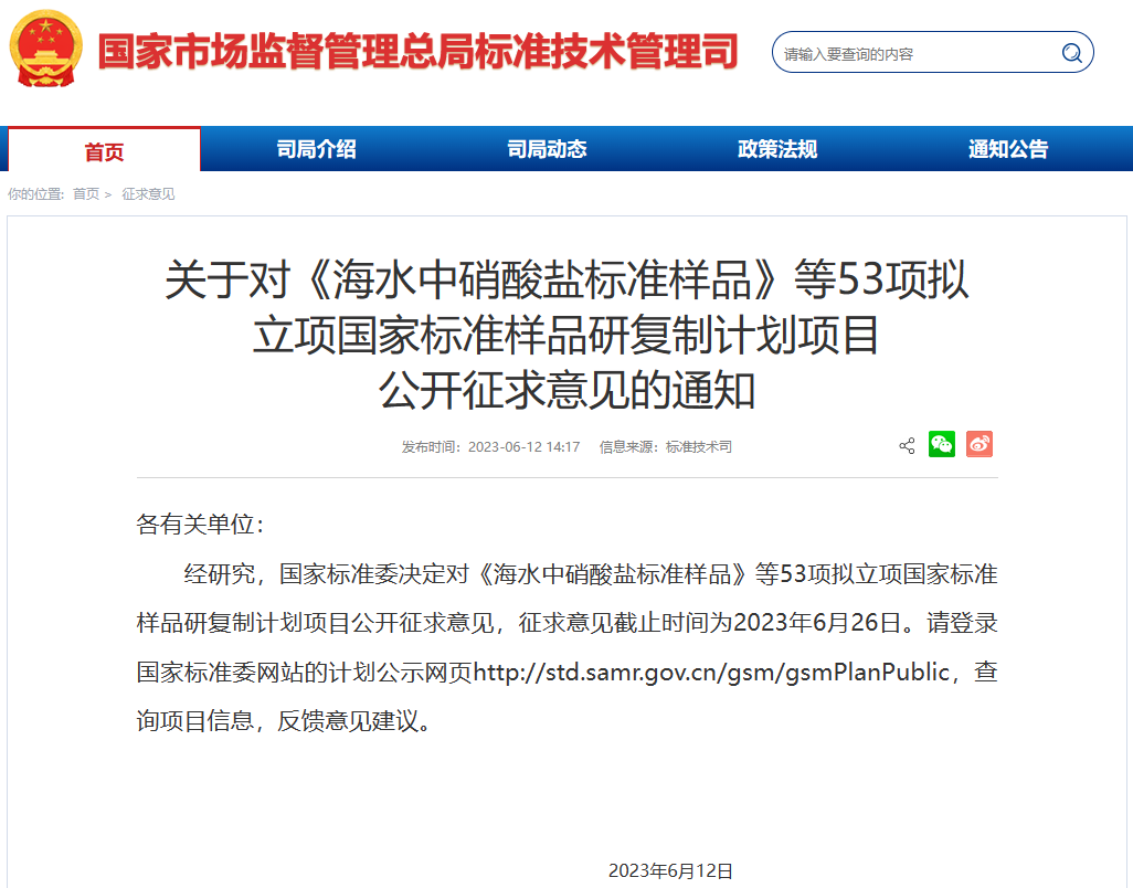 近日,國家市場監督管理總局標準技術管理司發布《關于對<海水中硝酸鹽標準樣品>等53項擬立項國家標準樣品研復制計劃項目公開征求意見的通知》,通知提到,經研究,國家標準委決定對《海水中硝酸鹽標準樣品》等53項擬立項國家標準樣品研復制計劃項目公開征求意見,相關項目信息可登錄國家標準委網站的計劃公示網頁查詢,并反饋意見建議。