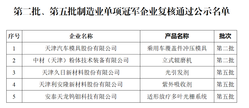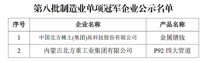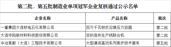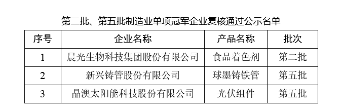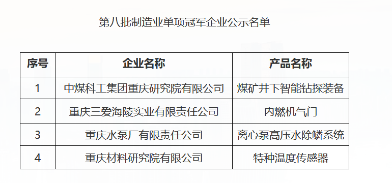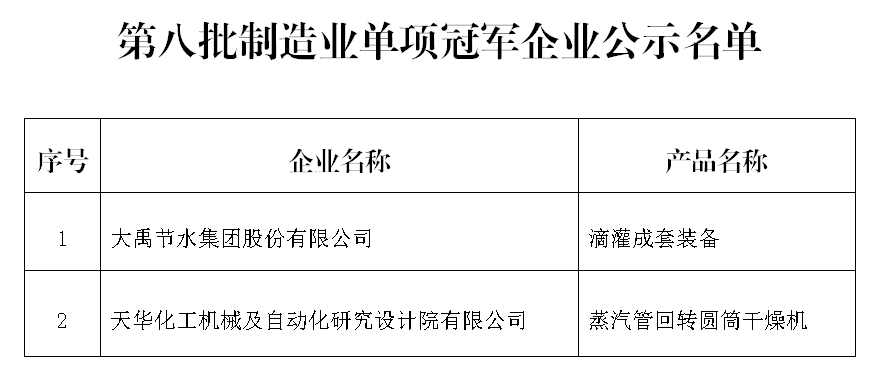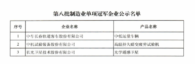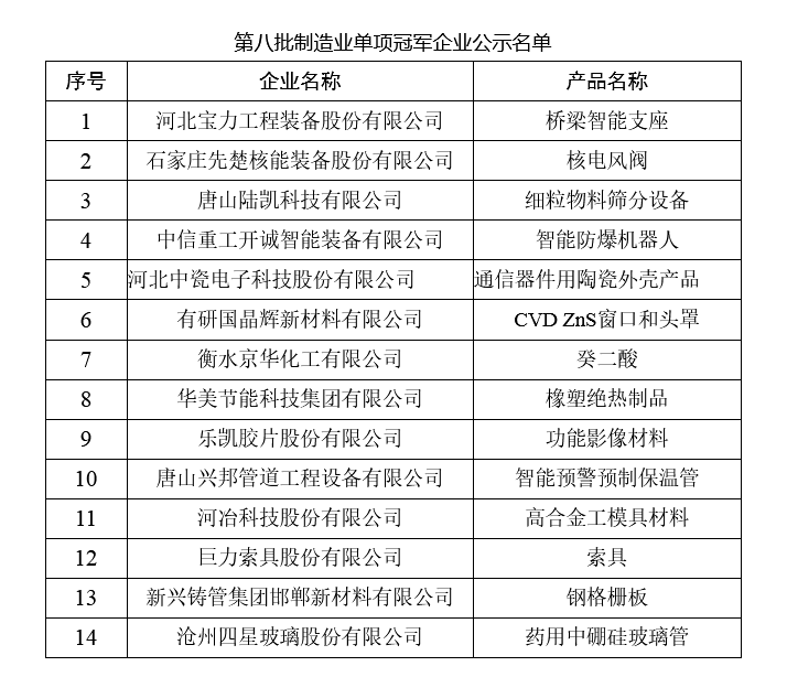第八批制造業單項冠軍企業公示名單