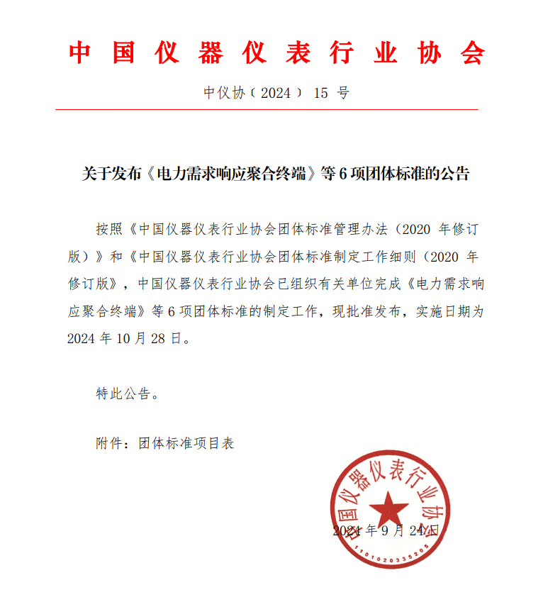 《電力需求響應聚合終端》等6項中國儀器儀表行業協會團體標準正式發布