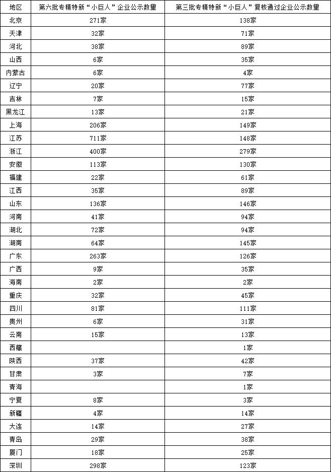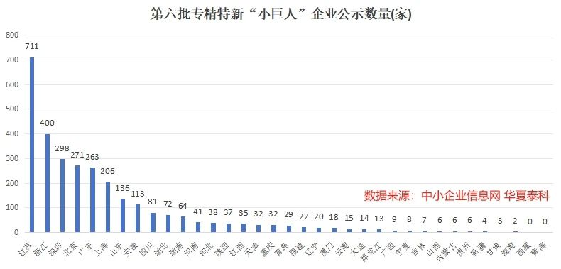第六批專精特新企業(yè)的分布省市情況呈現(xiàn)出明顯的地域差異,經(jīng)濟(jì)大省的“小巨人”企業(yè)數(shù)量遙遙領(lǐng)先。在此次公示的第六批專精特新 “小巨人” 企業(yè)中,江蘇、廣東(含深圳)和浙江數(shù)量較多,分別有711家、561家和400家,三個(gè)省份“小巨人”企業(yè)數(shù)量占比超過一半。
