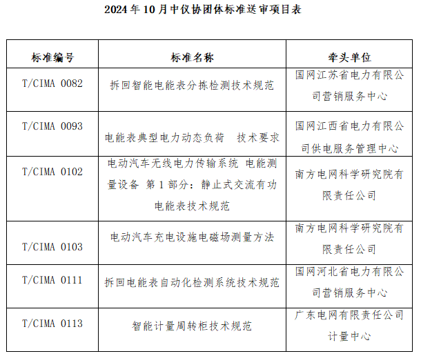 2024年10月 24-25日,中國儀器儀表行業(yè)協(xié)會(以下簡稱“協(xié)會”) 以視頻會議形式組織召開了《電能表典型電力動態(tài)負荷 技術要求》等6項團體標準(項目信息詳見附表)送審稿審查會。來自國網山東省電力公司電力科學研究院、廣東電網有限責任公司計量中心、中國電力科學研究院計量研究所、國網浙江省電力有限公司營銷服務中心、廣西電網計量中心、中國電力科學研究院有限公司、國網河南省電力公司營銷服務中心、國網山東省電力公司、黑龍江省電工儀器儀表工程技術研究中心有限公司的九位專家組成審查組,國網山東省電力公司電力科學研究院的徐民教授級高工擔任組長。會議由協(xié)會副秘書長程紅主持。協(xié)會及電工儀表分會的團體標準工作人員、標準主要起草人參加了本次會議。