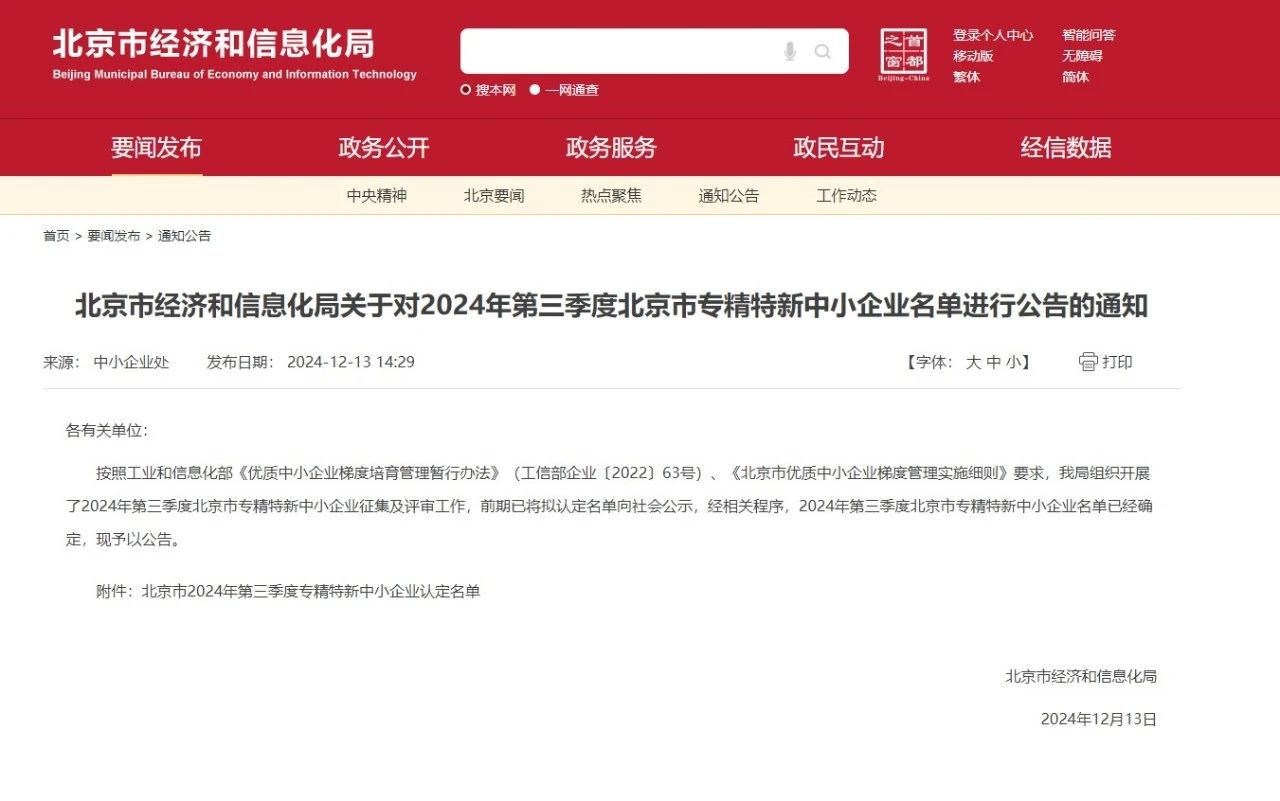 近日,北京市經濟和信息化局發布2024年度第三季度專精特新中小企業名單。西克麥哈克(北京)儀器有限公司憑借領先的技術能力,豐富的應用經驗與不懈的創新精神獲評北京市“專精特新”中小企業。