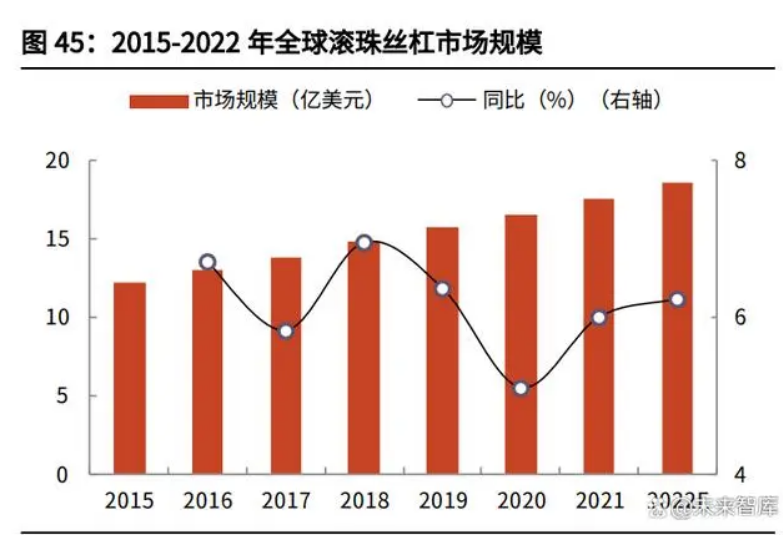 從市場(chǎng)空間來(lái)看,全球滾珠絲杠市場(chǎng)規(guī)模穩(wěn)健增長(zhǎng),中國(guó)已成為最重要的消費(fèi)市 場(chǎng)之一,長(zhǎng)期成長(zhǎng)空間可觀。根據(jù)秦川機(jī)床公告,2016-2021 年全球滾珠絲杠市 場(chǎng)規(guī)模從 13.1 億美元增長(zhǎng)至17.5 億美元;同期我國(guó)滾珠絲杠市場(chǎng)規(guī)模從 16.8 億元增長(zhǎng)至25.6 億元。中國(guó)已成為滾珠絲杠產(chǎn)品重要的消費(fèi)市場(chǎng)之一,約占全 球規(guī)模總量的 20%左右。從市場(chǎng)競(jìng)爭(zhēng)格局看,目前全球主要的滾珠絲杠廠商有 NSK、THK、SKF 等,根 據(jù)華經(jīng)產(chǎn)業(yè)研究院統(tǒng)計(jì),2021 年 CR5 銷(xiāo)售額市占率達(dá)到約 46%,其中主要來(lái)自 歐洲和日本,日本和歐洲滾珠絲杠企業(yè)占據(jù)了全球約 70%的市場(chǎng)份額。