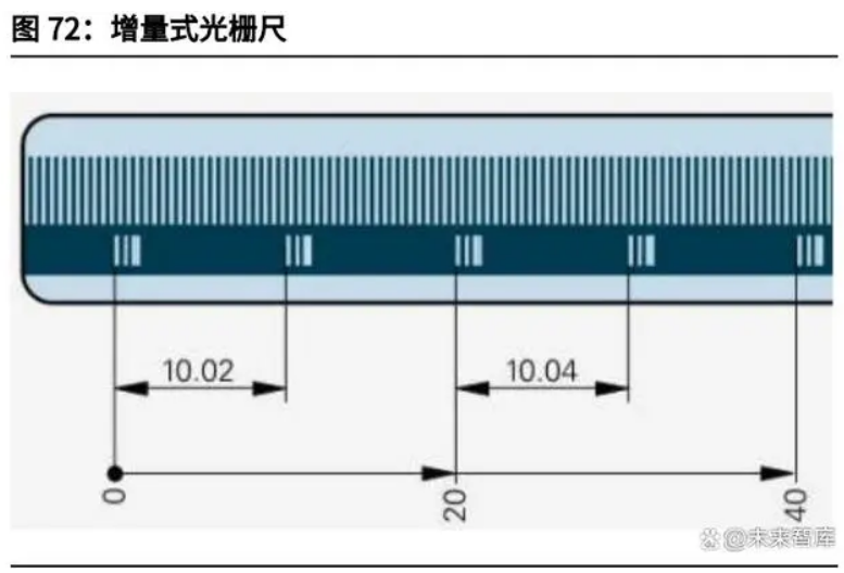 光柵尺是光柵線(xiàn)位移傳感器的簡(jiǎn)稱(chēng),是一種利用光柵原理實(shí)現(xiàn)線(xiàn)位移測(cè)量的傳感 器。光柵線(xiàn)位移傳感器主要應(yīng)用于直線(xiàn)移動(dòng)導(dǎo)軌機(jī)構(gòu),可實(shí)現(xiàn)移動(dòng)量的精確顯示 和自動(dòng)控制,廣泛應(yīng)用于金屬切削機(jī)床加工量的數(shù)字顯示和 CNC 加工中心位置 環(huán)的控制。按照材質(zhì)不同,可分為玻璃光柵和鋼光柵;按照測(cè)量原理可分為絕對(duì)式和增量式;按照掃描方式可分為成像掃描和干涉掃描;按照防護(hù)性能不同,可分為封閉式光 柵尺和開(kāi)放式光柵尺。從產(chǎn)品類(lèi)型及技術(shù)方面來(lái)看,目前增量式光柵尺由于較低的成本和技術(shù)要求,占 有超過(guò) 80%的份額。預(yù)計(jì)未來(lái)幾年,絕對(duì)式光柵尺將保持更快的增長(zhǎng)速度。