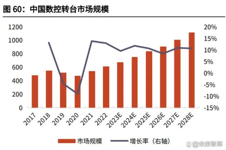 大陸及中國(guó)臺(tái)灣地區(qū)生產(chǎn)廠家生產(chǎn)的中低檔數(shù)控轉(zhuǎn)臺(tái)占據(jù)了我國(guó)大部分的轉(zhuǎn)臺(tái) 市場(chǎng);少部分市場(chǎng)由美國(guó)、德國(guó)、日本等國(guó)家公司生產(chǎn)的高端產(chǎn)品所占據(jù)。內(nèi)地 最具競(jìng)爭(zhēng)力的數(shù)控轉(zhuǎn)臺(tái)生產(chǎn)廠家是煙臺(tái)環(huán)球機(jī)床附件集團(tuán)有限公司,該廠家的產(chǎn) 品體系完備,規(guī)格齊全,種類(lèi)繁多,且設(shè)計(jì)開(kāi)發(fā)和制造方面具備豐富的經(jīng)驗(yàn)。中 國(guó)臺(tái)灣地區(qū)的德川機(jī)械股份有限公司是專(zhuān)業(yè)數(shù)控轉(zhuǎn)臺(tái)生產(chǎn)廠商之一。國(guó)外有日本 的 NIKKEN(日研)、德國(guó) Peiseler、美國(guó) HASS 公司等專(zhuān)業(yè)的生產(chǎn)廠家。國(guó)內(nèi) 生產(chǎn)的數(shù)控轉(zhuǎn)臺(tái)產(chǎn)品與國(guó)外的產(chǎn)品相比,在精度、速度及可靠性等參數(shù)上仍與國(guó) 外數(shù)控轉(zhuǎn)臺(tái)存在一定差距。2021 年中國(guó)數(shù)控轉(zhuǎn)臺(tái)市場(chǎng)銷(xiāo)售收入達(dá)到了 5.43 億美元,據(jù) QYResearch 預(yù)計(jì), 2028 年可以達(dá)到 11.17 億美元。從產(chǎn)品類(lèi)型及技術(shù)方面來(lái)看,單軸占有重要地位,2021 年份額達(dá)到 89.43%, 銷(xiāo)量達(dá)到 58678 臺(tái),而雙軸由于價(jià)格較貴,從 2021 年銷(xiāo)量上來(lái)看僅為單軸的 1/9,達(dá)到 6935 臺(tái),但銷(xiāo)售額超過(guò)單軸的 1/3,達(dá)到 1.44 億美元。預(yù)計(jì)未來(lái)單 軸和雙軸的比例穩(wěn)定,在 2028 年,單軸的銷(xiāo)量將達(dá)到 104280 臺(tái),而雙軸達(dá)到 13671 臺(tái)。從產(chǎn)品市場(chǎng)應(yīng)用情況來(lái)看,與立式數(shù)控機(jī)床配套使用的數(shù)控轉(zhuǎn)臺(tái)最多,接近 60%,在 2021 年達(dá)到 38816 臺(tái),而臥式和龍門(mén)分別達(dá)到 19330 臺(tái)與 7467 臺(tái)。未來(lái)增長(zhǎng)速度最快的為龍門(mén)數(shù)控機(jī)床,2022-2028 年的 CAGR 達(dá)到 9.69%。目 前中國(guó)主要廠商包括旭陽(yáng)國(guó)際精機(jī)、寶嘉誠(chéng)、德川機(jī)械、潭佳精密科技和潭興精 工等,2021 年 Top5 廠商份額占比超過(guò) 50%。