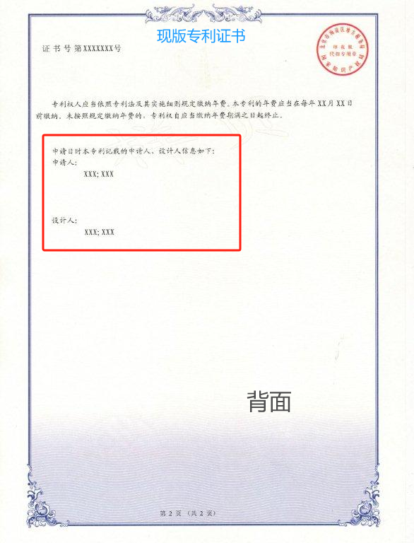 2.專利申請日時申請人、發(fā)明人信息,從證書背面來到證書正面。