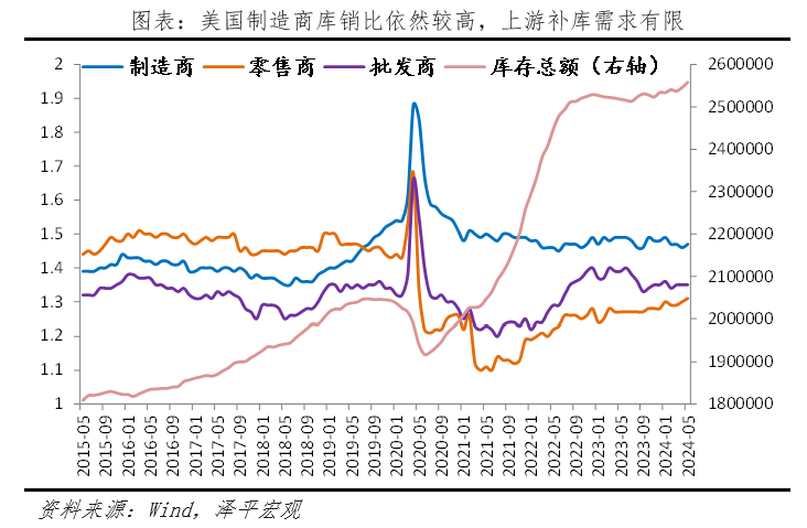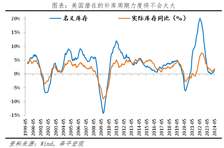 1)美國經(jīng)濟出現(xiàn)三點放緩信號,但著陸方式尚不確定。一是當(dāng)前美國家庭儲蓄率出現(xiàn)下滑,高水平的消費支出可能在長期內(nèi)難以持續(xù);二是長期高利率下,需求不足、新屋開工率下滑,拖累住宅投資和建筑投資。三是補庫周期較弱,從名義庫存的角度看,美國庫存去化較快。但高通脹導(dǎo)致以名義庫存視角判斷補庫力度(涵蓋工業(yè)品價格與工業(yè)品數(shù)量需求)在當(dāng)前指導(dǎo)意義較差。若從實際庫存來看,美國本輪去庫程度較為有限,本輪補庫強度可以參考2016年底的補庫周期,整體力度不會太大,更多的是行業(yè)層面的結(jié)構(gòu)性補庫。