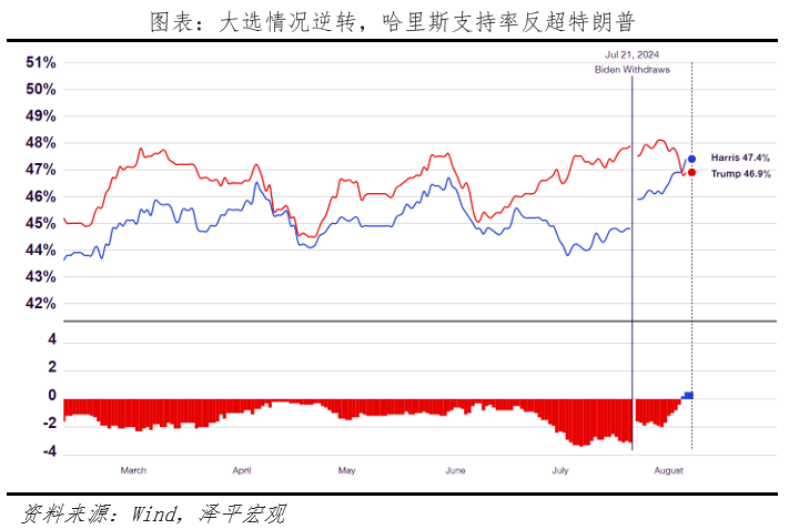 3)美國大選選情膠著,但候選人對華遏制態(tài)度不變。7月拜登退選,哈里斯迎來“政治蜜月期”,民調(diào)支持率反超特朗普,但選舉人票數(shù)仍落后于特朗普,選舉局勢不確定性較強。我們曾在《美國大選展望:特朗普會否重返白宮及影響》中設(shè)想兩種情景:一種是特朗普當(dāng)選,美國將通脹再起、利率維持高位,逆全球化,可能引起美國再通脹、提高關(guān)稅,惡化盟友關(guān)系。另一種情形是哈里斯當(dāng)選,主張團結(jié)盟友、支持創(chuàng)新、上調(diào)最低工資、保護薪水福利、醫(yī)改、接受難民等,預(yù)計將聯(lián)合盟友向中國施壓。但對華政策方面,無論誰當(dāng)選預(yù)計都將保持遏制態(tài)度。