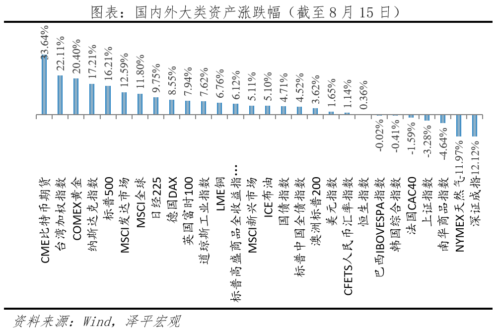 2024年初以來大類資產(chǎn)走勢分化,海外資產(chǎn)表現(xiàn)整體優(yōu)于國內(nèi)市場。海外市場權(quán)益市場領(lǐng)漲。2024年初至8月15日,WIND全球股票上漲12.70%,其中發(fā)達市場13.50%,新興市場5.95%,美歐漲幅靠前。標(biāo)普商品指數(shù)5.95%,其中貴金屬、能源、軟商品兩位數(shù)漲幅領(lǐng)漲。國內(nèi)市場,債市走牛、權(quán)益復(fù)蘇乏力。截至8月15日,上證指數(shù)-3.28%,WIND境內(nèi)債券上漲4.54%,人民幣匯率指數(shù)1.1394%,小幅走強,南華商品指數(shù)-3.59%。上半年表現(xiàn)較好的資產(chǎn)有三類,一是以去美元化、避險屬性為主的比特幣和黃金;二是供給因素推動的原油,全球制造業(yè)復(fù)蘇邏輯的有色金屬類大宗品;三是價值風(fēng)格的日本股市、AI浪潮的美國科技股等。