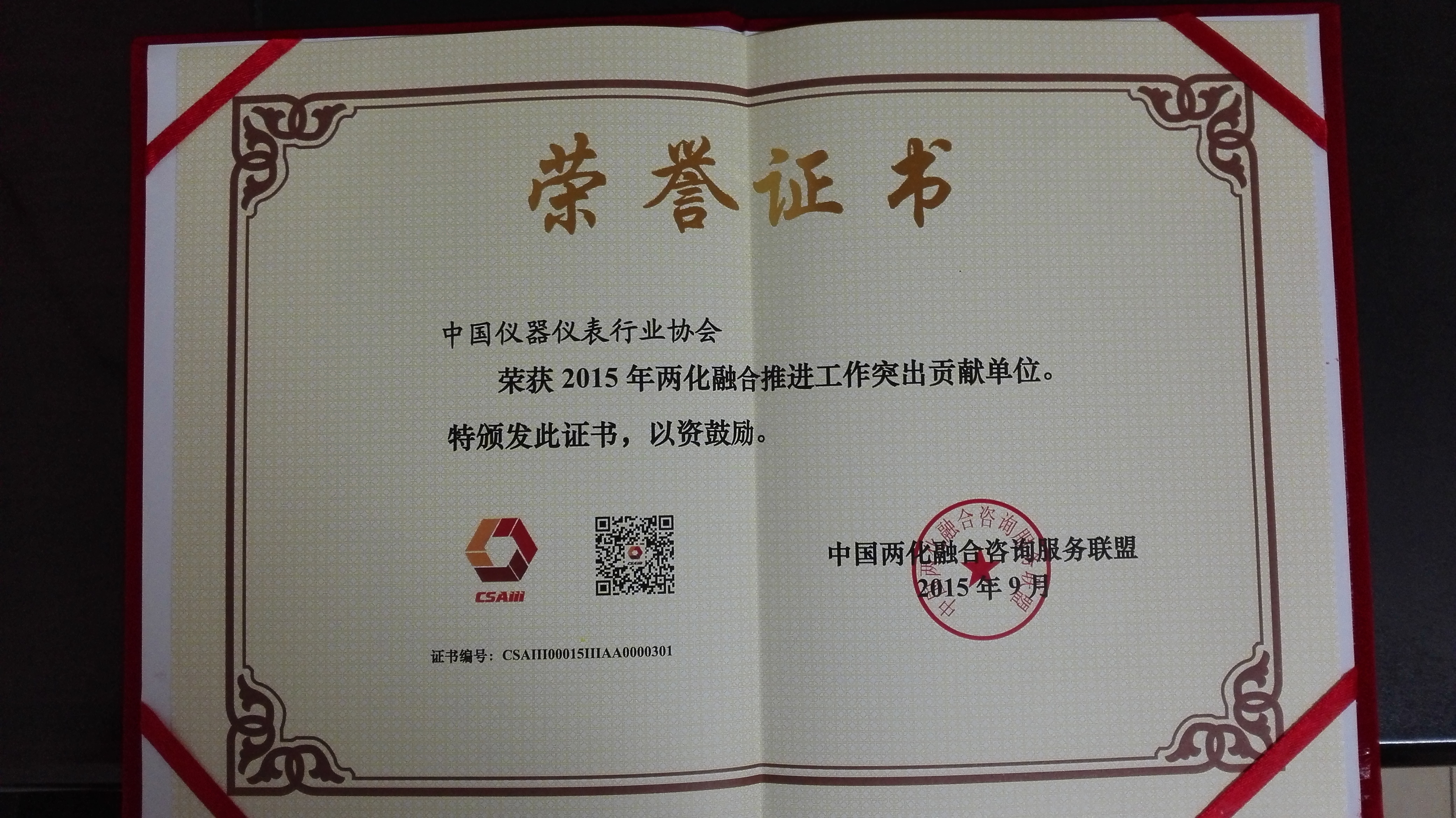 中國儀器儀表行業(yè)協(xié)會作為工信部“儀器儀表行業(yè)企業(yè)生產(chǎn)過程信息化示范及推廣應用”試點項目的承擔單位,在儀器儀表行業(yè)大力推進生產(chǎn)過程信息化,取得了顯著成績,榮獲2015年兩化融合推進工作突出貢獻單位。