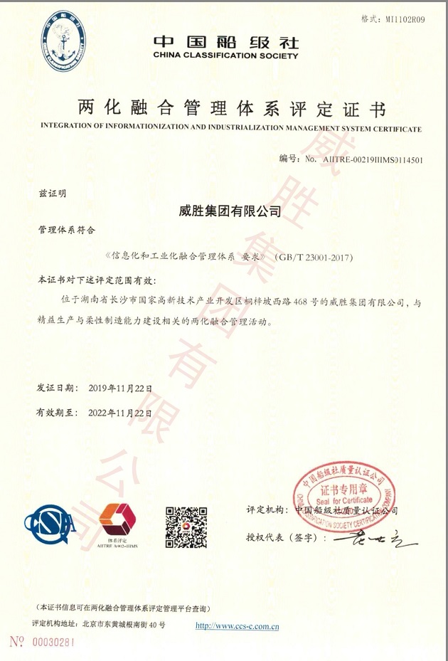 兩化融合管理體系評(píng)定證書
