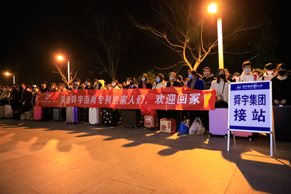 “乘坐舜宇返崗專列的家人們,歡迎回家。”2020年2月18日晚,高鐵余姚北站和寧波站接站口,迎接舜宇員工的橫幅格外鮮亮。三輛搭載著舜宇職工的“員工專列”先后抵達(dá),近300名來自周口、阜陽(yáng)、成都、貴州、南昌、上饒等地區(qū)的舜宇員工及其親屬友人在政府及公司工作人員的引導(dǎo)下,井然有序地出站。