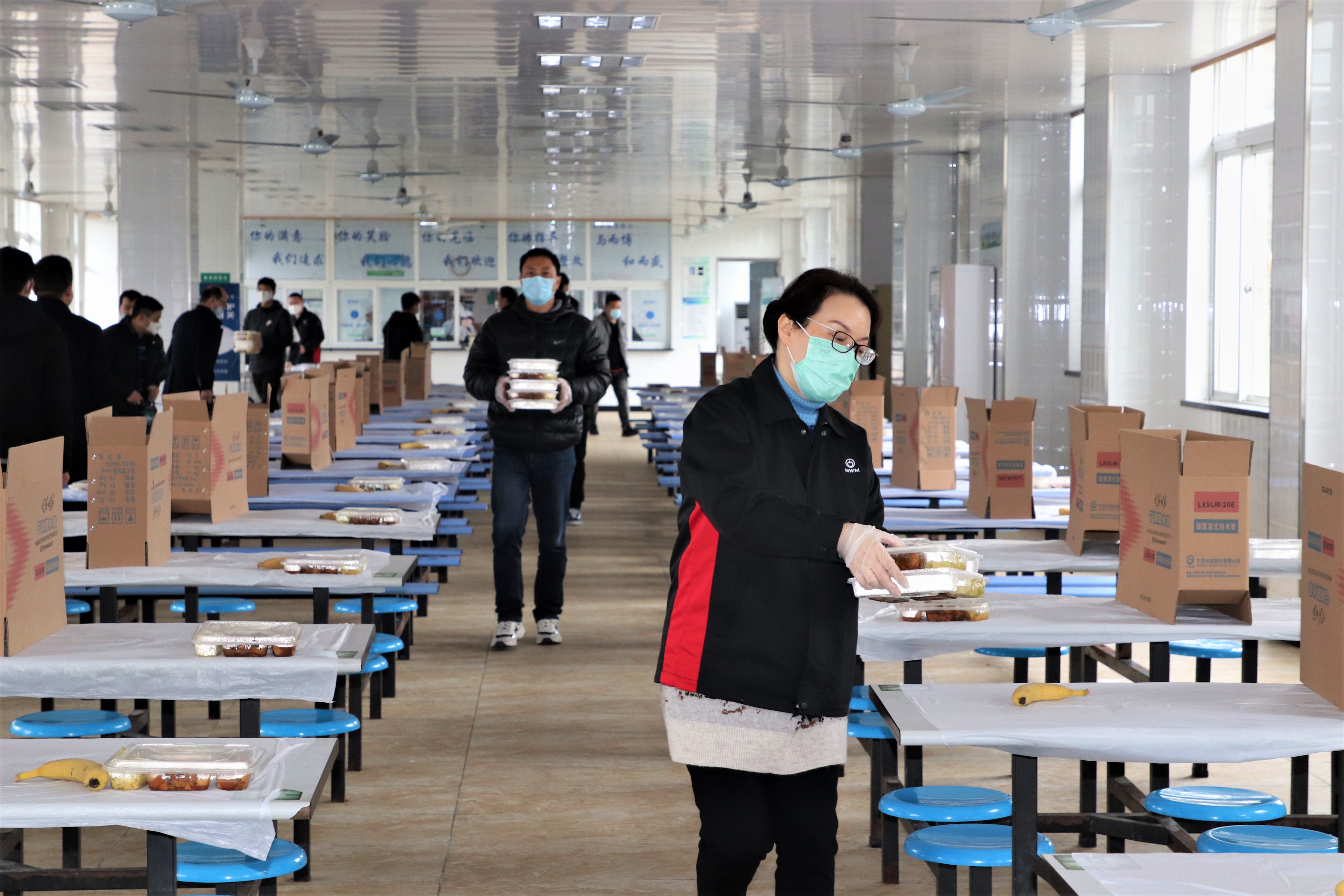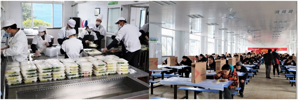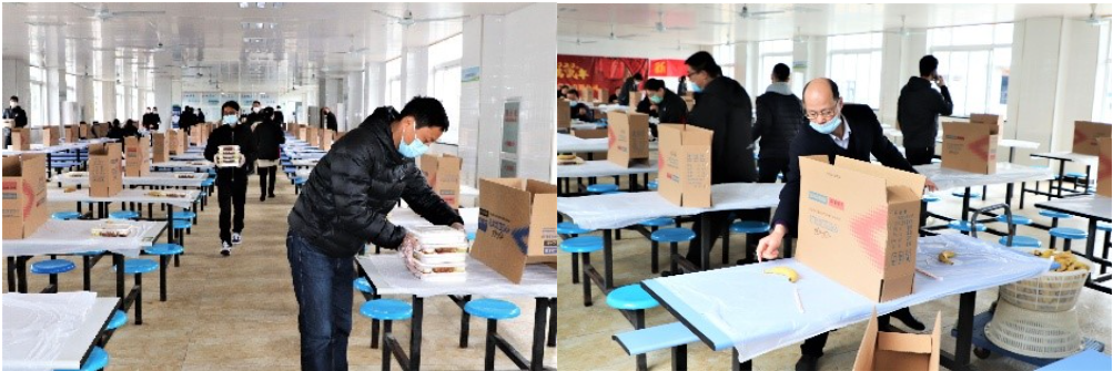 在清晨的寒風(fēng)中,他們站立于門崗口,手持測(cè)溫槍,為前來上班的員工一一測(cè)量體溫……不到中午11點(diǎn),又總能看到那么幾個(gè)身影出現(xiàn)在食堂。他們?yōu)槊颗斡貌蛦T工提前鋪好一次性餐布,擺放好餐具、餐盤,直至將所有批次分餐結(jié)束……