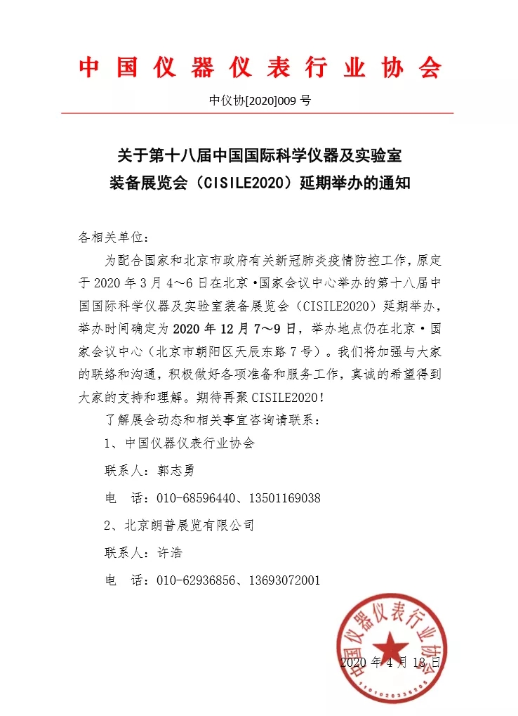 為配合國(guó)家和北京市政府有關(guān)新冠肺炎疫情防控工作,原定于 2020 3 46 日在北京·國(guó)家會(huì)議中心舉辦的第十八屆中國(guó)國(guó)際科學(xué)儀器及實(shí)驗(yàn)室裝備展覽會(huì)(CISILE2020)延期舉辦,舉辦時(shí)間確定為 2020 12 79 日,舉辦地點(diǎn)仍在北京·國(guó)家會(huì)議中心(北京市朝陽(yáng)區(qū)天辰東路 7 號(hào))。我們將加強(qiáng)與大家的聯(lián)絡(luò)和溝通,積極做好各項(xiàng)準(zhǔn)備和服務(wù)工作,真誠(chéng)的希望得到大家的支持和理解。期待再聚 CISILE2020