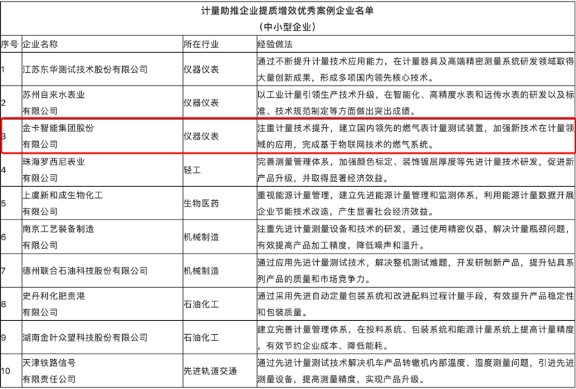 近日,國家市場監(jiān)督管理總局計量司下發(fā)《市場監(jiān)管總局辦公廳關于宣傳推廣計量助推企業(yè)提質增效典型案例的通知》,要求各地加大對企業(yè)計量工作典型做法和經驗案例的宣傳推廣,其中金卡智能等30家企業(yè)“榜上有名”。