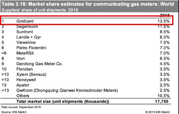 金卡智能已步入全球物聯(lián)網(wǎng)表計第一方陣。據(jù)HIS Markit統(tǒng)計,金卡智能燃?xì)饨K端全球市場占有率排名第一。