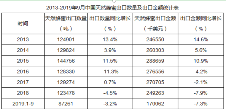 圖3:蜂蜜出口數(shù)量、金額統(tǒng)計表
