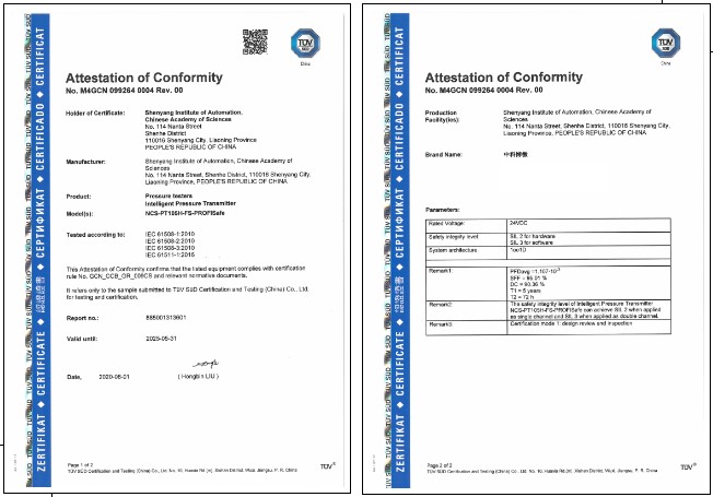 近日,中國科學院沈陽自動化研究所獲得了國際認證機構TüV (南德意志大中華集團)頒發的總線型智能壓力變送器SIL2/3功能安全認證證書,這是我國首張總線型壓力變送器安全認證證書。此前,沈陽自動化所獲得了該機構頒發的智能溫度變送器SIL2/3功能安全認證證書。