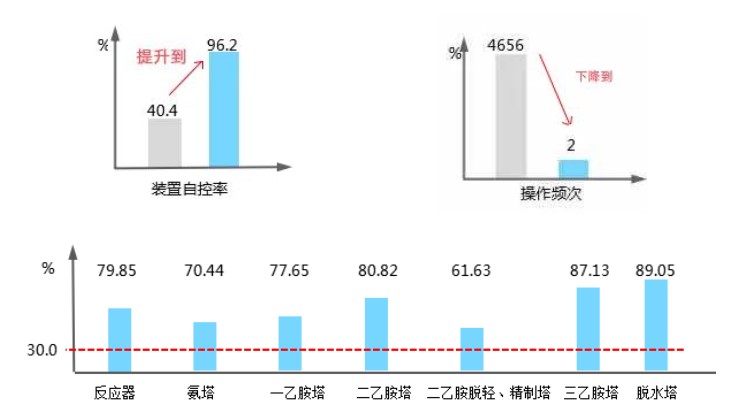 基于以上分析,中控技術(shù)結(jié)合乙胺裝置工藝特點(diǎn)和過程控制需求,采用多變量模型預(yù)測控制,結(jié)合專家控制等智能控制策略,實(shí)現(xiàn)乙胺裝置多目標(biāo)優(yōu)化和協(xié)同控制,提高裝置生產(chǎn)運(yùn)行的平穩(wěn)性,降低操作人員勞動(dòng)強(qiáng)度,為生產(chǎn)過程提供安全保障并通過“卡邊”優(yōu)化,降低能耗。