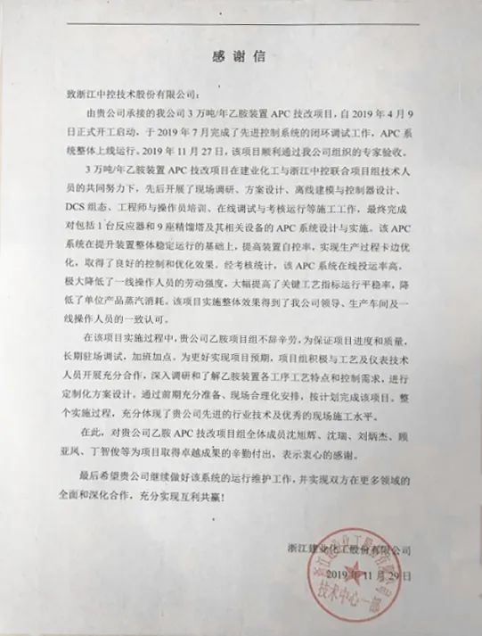 與此同時(shí),乙胺裝置先進(jìn)控制系統(tǒng)的價(jià)值得到了建業(yè)化工的一致認(rèn)可。2020年4月,建業(yè)化工再次選擇與中控技術(shù)合作,簽訂了異丙胺、乙胺三期、丁胺、正丙胺、醋酸酯等5套裝置先進(jìn)控制系統(tǒng);雙方互信共贏,共同促進(jìn)建業(yè)化工逐步走向更高效、更精細(xì)、更智能的生產(chǎn)模式,為國內(nèi)有機(jī)胺行業(yè)探索一條安全生產(chǎn)、綠色環(huán)保、節(jié)能降耗、質(zhì)量提升、降本增效的新路徑。