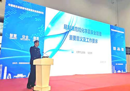 北京市公安局治安管理總隊危險物品管理支隊谷寶峰中隊長首先上臺演講。谷隊長以“易致爆危險化學品安全管理重要意義及工作要求”為題,通過引用國內外及其在工作中偵辦的真實案例生動的講述了易致爆危險化學品、易制毒危險化學品對人身和社會帶來的嚴重危害,著重介紹了相關法律法規,闡述了做好危化品管理對于建設“平安中國”的重要意義。