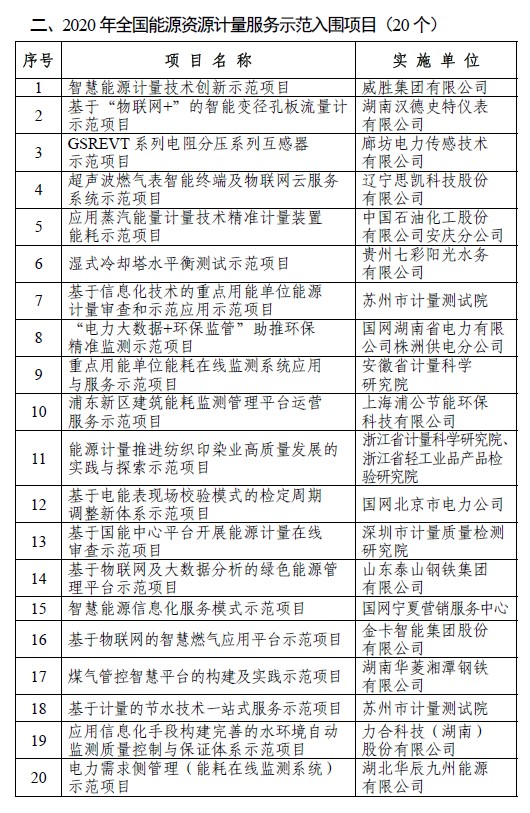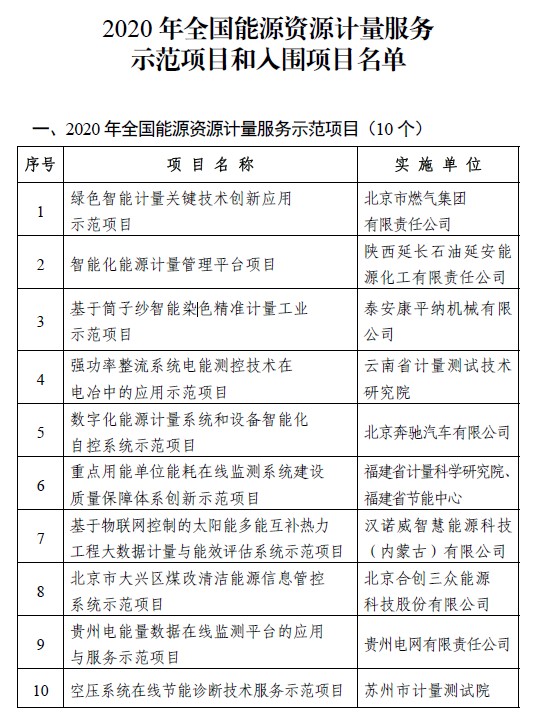近日,根據(jù)《市場監(jiān)管總局辦公廳 國家發(fā)展改革委辦公廳關(guān)于組織開展2020年度能源資源計量服務示范活動的通知》(市監(jiān)計量〔2020〕94號)要求,市場監(jiān)管總局辦公廳將擬入選2020年能源資源計量服務示范項目和入圍項目名單進行公示。其中,蘇州計量測試院能源計量中心的“空壓系統(tǒng)在線節(jié)能診斷技術(shù)服務示范項目”進入全國2020年能源資源計量服務示范項目公示目錄,全國共10個。威勝集團有限公司的“智慧能源計量技術(shù)創(chuàng)新示范項目”、廊坊電力傳感技術(shù)有限公司的“GSREVT 系列電阻分壓系列互感器示范項目”、蘇州市計量測試院的“基于信息化技術(shù)的重點用能單位能源計量審查和示范應用示范項目”和“基于計量的節(jié)水技術(shù)一站式服務示范項目”、力合科技( 湖南)股份有限公司的“應用信息化手段構(gòu)建完善的水環(huán)境自動監(jiān)測質(zhì)量控制與保證體系示范項目”、金卡智能集團股份有限公司的“基于物聯(lián)網(wǎng)的智慧燃氣應用平臺示范項目"進入全國2020年能源資源計量服務示范入圍項目公示目錄,全國共20個。