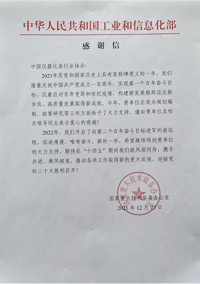 近日,工業和信息化部重大技術裝備辦公室、商務部對外貿易司向中國儀器儀表行業協會發來感謝信,對協會2021年在發揮行業組織橋梁紐帶作用、凝聚行業發展共識、反映行業運行訴求、促進行業健康發展、為相關部門提供信息支撐和決策參考等方面發揮的作用和開展的工作給予高度評價,對協會積極配合部委工作給予的大力支持表示誠摯感謝。