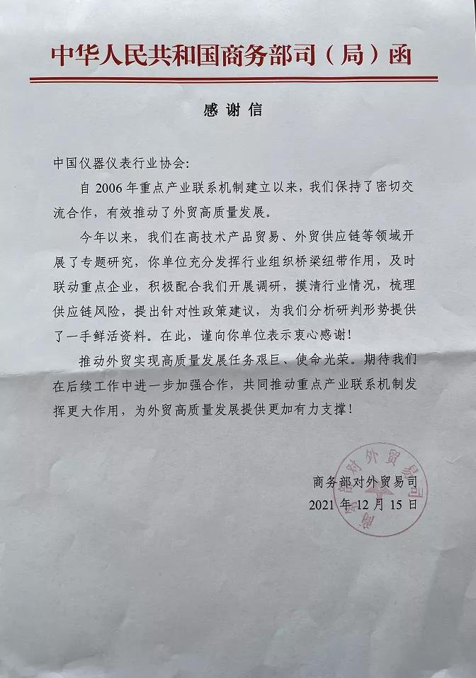 工信部、商務部感謝信“點贊”中國儀器儀表行業協會!
