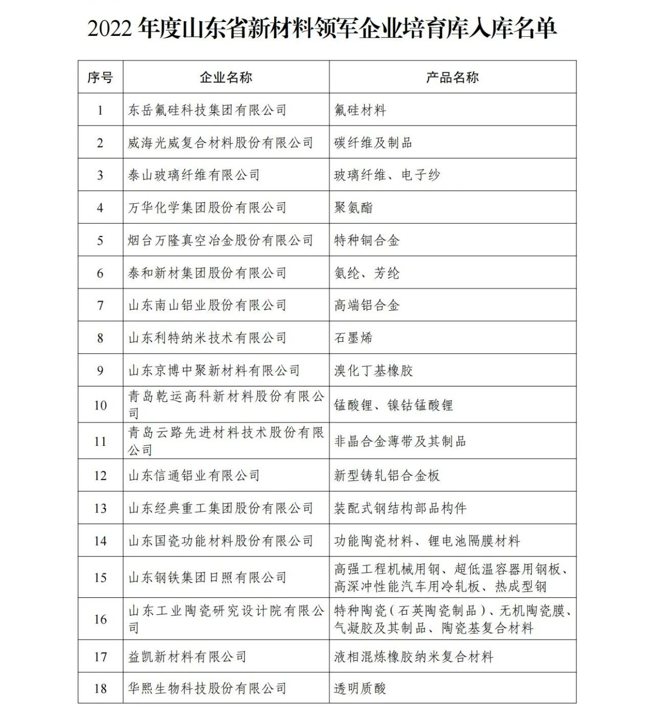 為加快實施新材料領軍企業培育工程,根據《山東省新材料產業發展專項規劃(2018-2022年)》《關于組織開展2022年度山東省新材料領軍企業申報工作的通知》(魯工信新材〔2022〕269號)要求,經企業申報、各市推薦、專家評審和網上公示,確定了《2022年度山東省新材料領軍企業培育庫入庫名單》和《2022年度山東省新材料領軍企業50強名單》,現予以公布。