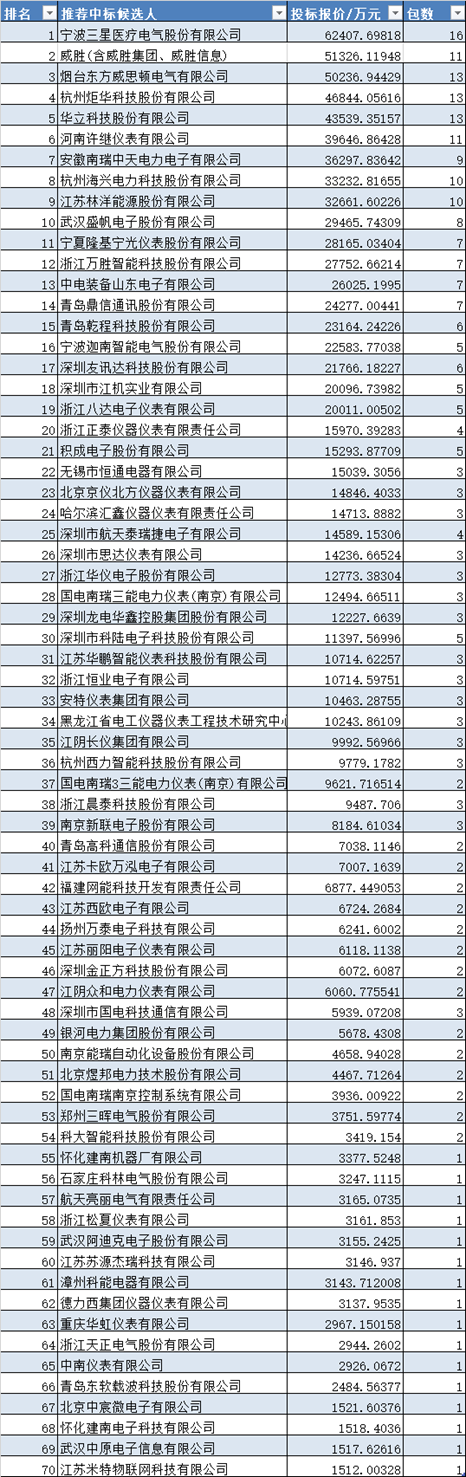 近日,國網2022年第二次電能表(含用電信息采集)招標采購推薦的中標候選人公示信息發布。電能表招標采購6類284包物資,投標報價合計1017238萬元,占2021年度全年金額的50.7%。由71家企業提供,其中電能表分項中標企業共59家,相比2022年第一次招標增加1家;用電信息采集分項中標企業37家,相比2022年第一次招標減少1家。本次中標金額前三名企業為寧波三星醫療電氣股份有限公司、威勝(含威勝集團、威勝信息)、煙臺東方威思頓電氣有限公司。