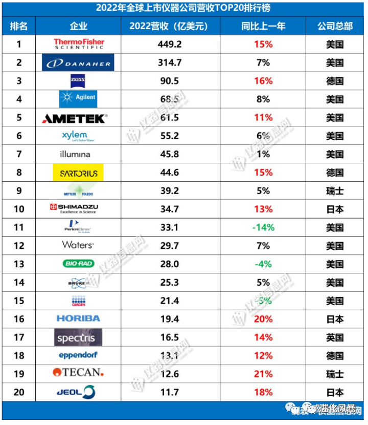 2022年全球Top20的儀器廠家之中,美國有11家,日本,德國各3家,瑞士2家,英國1家,沒有一家企業出自中國,而在前十家名單之中,有6家企業來自美國。