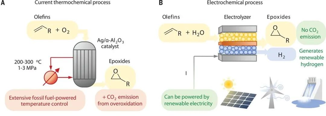 加拿大多倫多大學(xué)Edward H. Sargent院士課題組采用電化學(xué)合成法,借助氧化還原介質(zhì)氯離子,在常溫常壓下達成電極和乙烯之間的電子交換,將乙烯成功轉(zhuǎn)化為環(huán)氧乙烷和環(huán)氧丙烷(圖B)。相對于傳統(tǒng)熱合成環(huán)氧乙烷/環(huán)氧丙烷的嚴(yán)苛條件,如高溫高壓(200-300°C,1~3Mpa),Ag催化乙烯完成環(huán)氧乙烷的合成(圖A),且生產(chǎn)1噸的環(huán)氧乙烷就會同時排放0.9噸的CO2, 文中采用綠色電化學(xué)方法實現(xiàn)了零碳排、更溫和和更具選擇性的環(huán)氧乙烷/環(huán)氧丙烷的合成,有望代替苛刻的熱合成法,實現(xiàn)工業(yè)化,文章發(fā)表在Science上[2]。