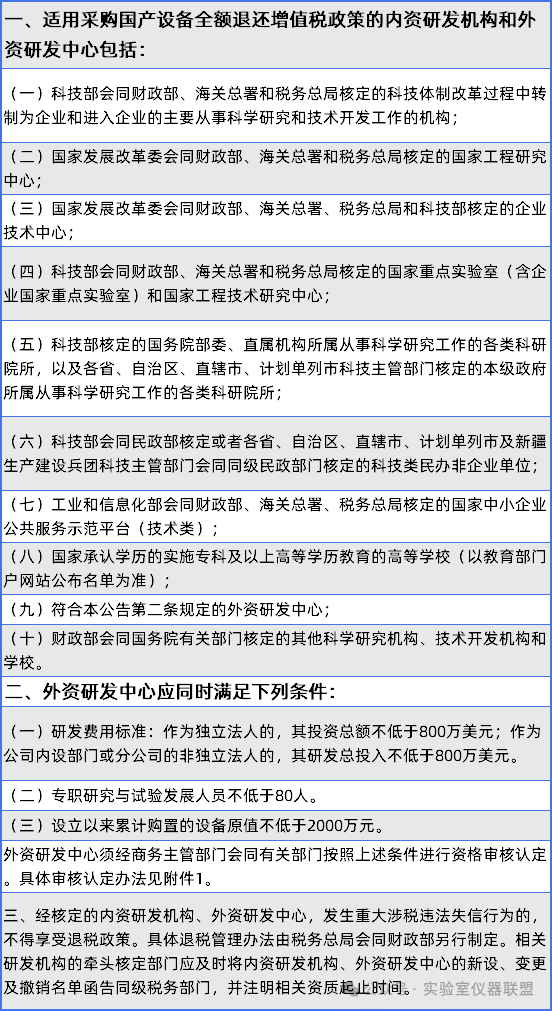 涉及全額退還增值稅的相關(guān)設備清單,也在財政部、商務部、稅務總局三部門去年8月印發(fā)的《關(guān)于研發(fā)機構(gòu)采購設備增值稅政策的公告》中做了詳細公布。