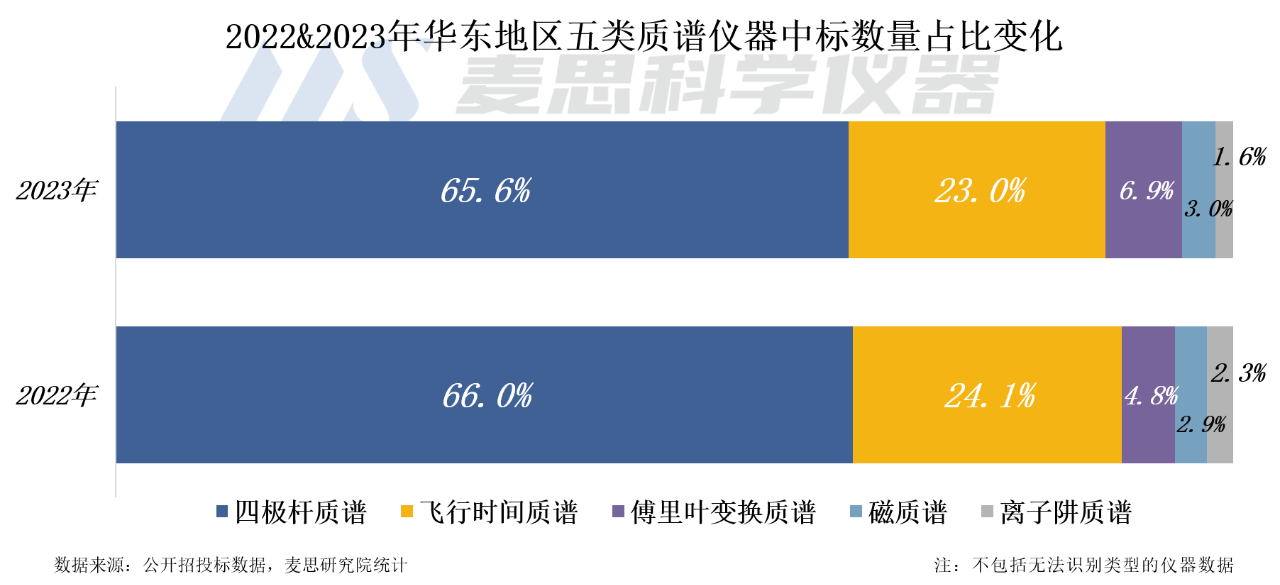 從各技術路線看,2023年華東地區四極桿質譜中標數量最多,占比65.6%,與2022年持平。飛行時間質譜排名第二,中標數量占比為23.0%,同比減少1.1個百分點。傅里葉變換質譜的占比為6.9%,排名第三,同比增加2.1個百分點。