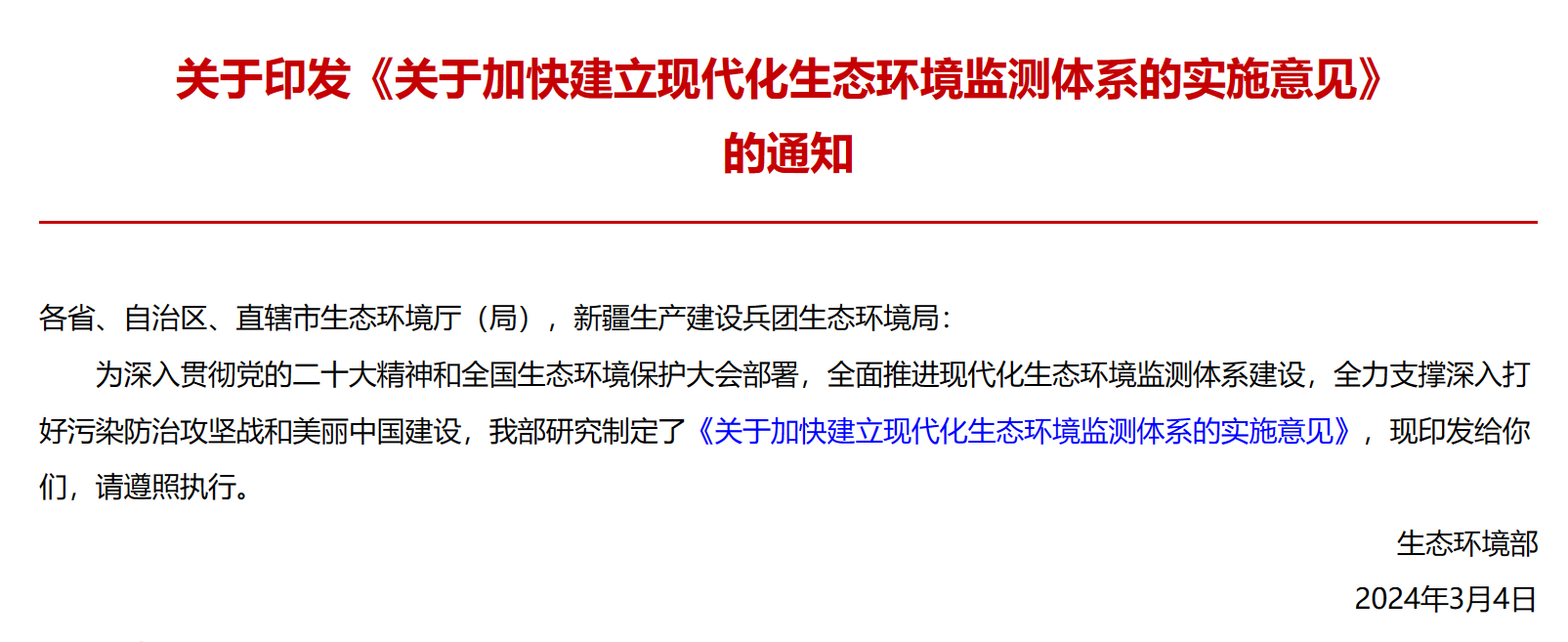 為深入貫徹習近平總書記重要指示精神,落實好全國生態環境保護大會部署,我部制定出臺了《意見》,構建現代化生態環境監測體系框架,明確現代化監測體系建設的基本思路、總體目標、主要任務和保障措施,作為今后一個時期監測發展的指導性文件。