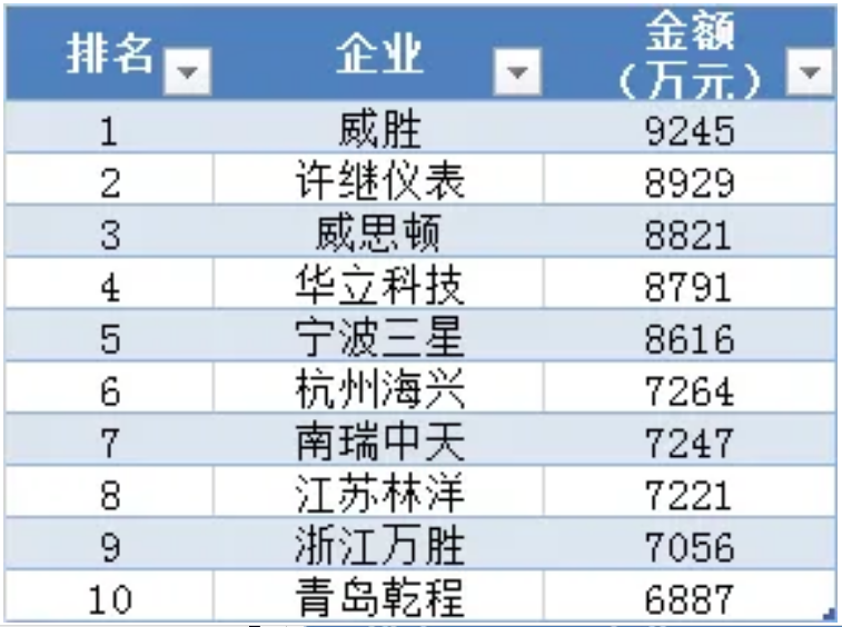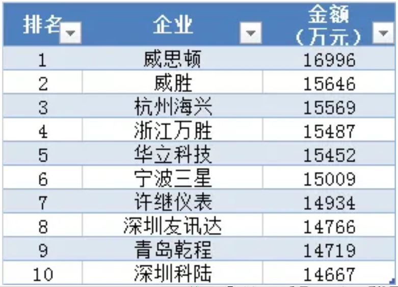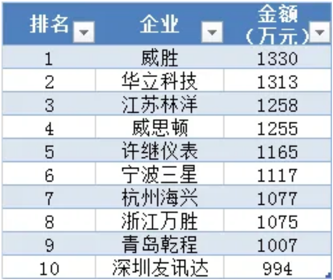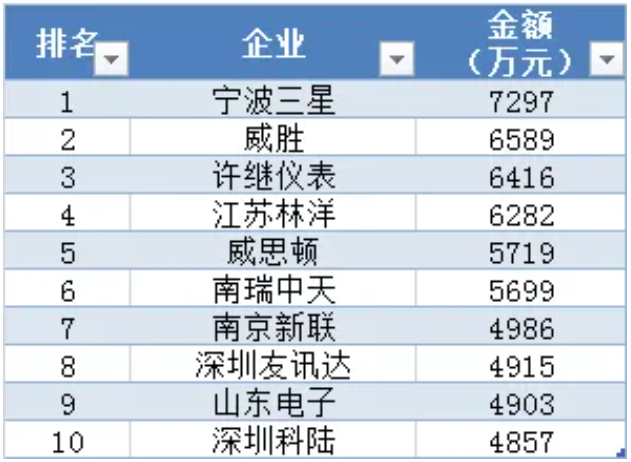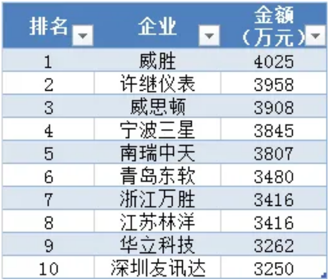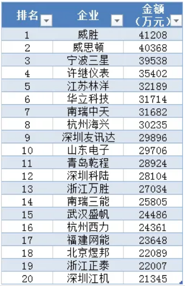集中器及采集器中標(biāo)金額前十企業(yè)