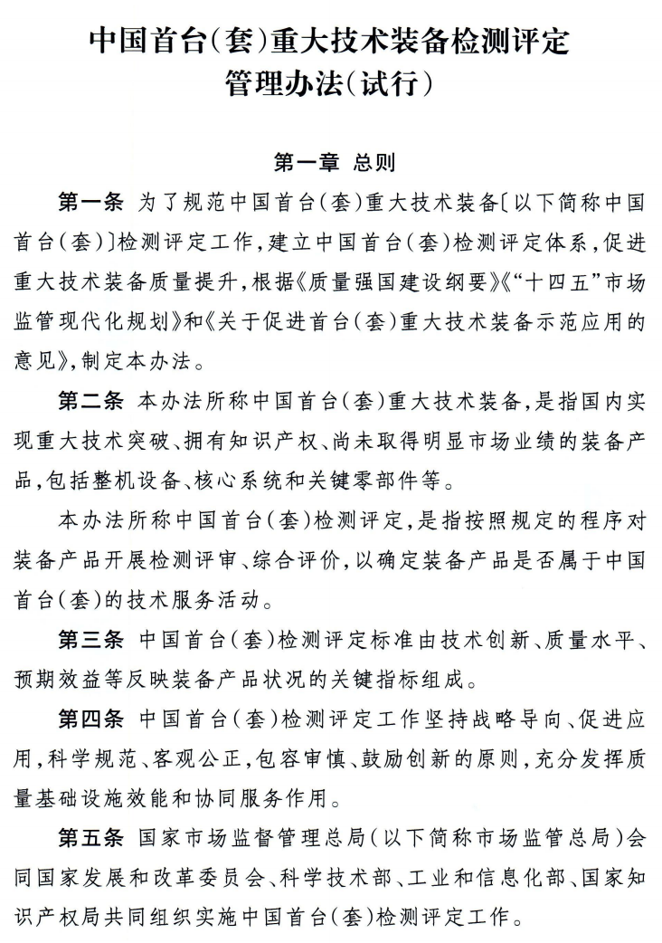 為促進我國重大技術裝備質量提升,支撐重大技術裝備攻關工程,推動制造業高端化、智能化、綠色化發展,加快推進新型工業化,市場監管總局、國家發展改革委、科技部、工業和信息化部、國家知識產權局5部門近日聯合印發《中國首臺(套)重大技術裝備檢測評定管理辦法(試行)》(以下簡稱《辦法》)。