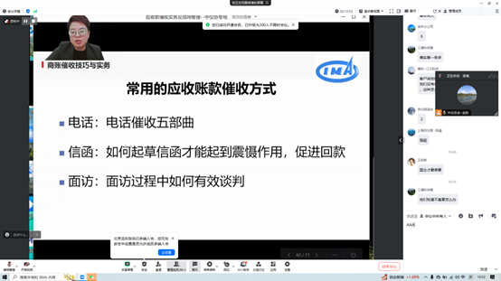 授課直播間氛圍熱烈,學員與授課老師頻頻互動交流,咨詢在業(yè)務(wù)開展中實際糾紛的化解策略。授課老師針對賬款催收中訴訟手段和非訴訟手段的適用場景進行細致解答。學員紛紛表示,培訓內(nèi)容切中企業(yè)痛點,突出應(yīng)收賬款催收技巧實效性,有助于提高企業(yè)運營效率,降低壞賬風險。