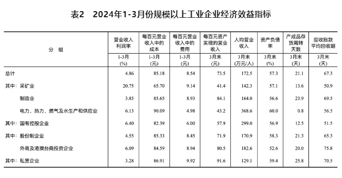 1-3月份,規模以上工業企業實現營業收入30.96萬億元,同比增長2.3%;發生營業成本26.38萬億元,增長2.5%;營業收入利潤率為4.86%,同比提高0.09個百分點。