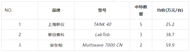 從中標(biāo)數(shù)量來(lái)看,位居榜首的則是上海新儀,中標(biāo)數(shù)量為7套;緊隨其后的是安東帕和上海屹堯,兩者均以5套的中標(biāo)量并列第二名;萊伯泰科則以4套的中標(biāo)量排在第三位;上海元析中標(biāo)2套,其他各品牌分別中標(biāo)1套。