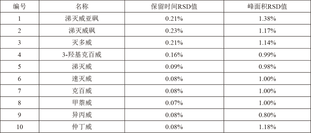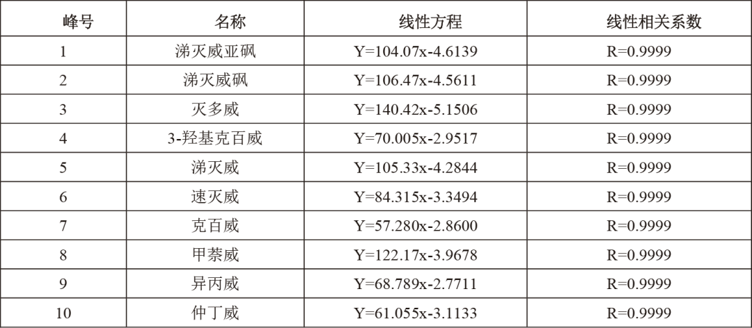 10種氨基甲酸酯在0.0510.0 mg/L(測試濃度)范圍內均達到0.9999線性相關系數,具有良好的線性相關性。