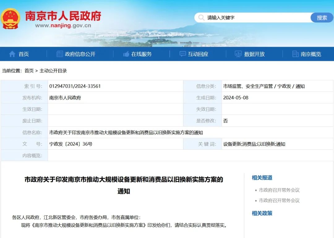 5月10日,從南京市人民政府官網獲悉,《南京市推動大規模設備更新和消費品以舊換新實施方案》已正式印發。