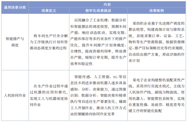 通用場景是指滿足不同行業(yè)數(shù)字化轉(zhuǎn)型共性需求的場景,具備在同行業(yè)內(nèi)及不同行業(yè)間的推廣價(jià)值。通用場景部分整理了裝備制造、電子信息和消費(fèi)品 3 個(gè)行業(yè)存在共性需求和相似解決方案的數(shù)字化典型場景,包括智能排產(chǎn)與調(diào)度、人機(jī)協(xié)同作業(yè)、質(zhì)量智能檢測、全過程質(zhì)量追溯、全流程精益生產(chǎn)管理、能耗數(shù)據(jù)采集與監(jiān)測、環(huán)境智能監(jiān)測與調(diào)節(jié) 7個(gè)場景,場景內(nèi)容見表 1。