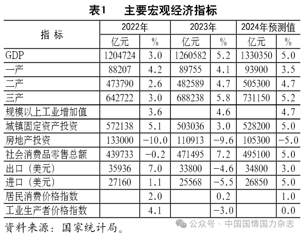 2023年是三年新冠肺炎疫情防控轉段后經濟恢復發展的一年,經濟同比增速呈現出“前低、中高、后穩”的特征,全年經濟增長5.2%,就業達到1244萬人,物價低位運行;新興產業增長較快,產業結構繼續轉型升級;科技創新實現新的突破,涌現出一批科技創新成果;金融、科技等機構改革取得進展;糧食、能源供給充足,地方債風險得到化解,安全發展基礎鞏固夯實;居民收入增長快于經濟增長,農村居民人均可支配收入高于城鎮居民,民生保障有力有效。但我國經濟發展過程中仍面臨一些突出矛盾和問題,需引起高度關注。