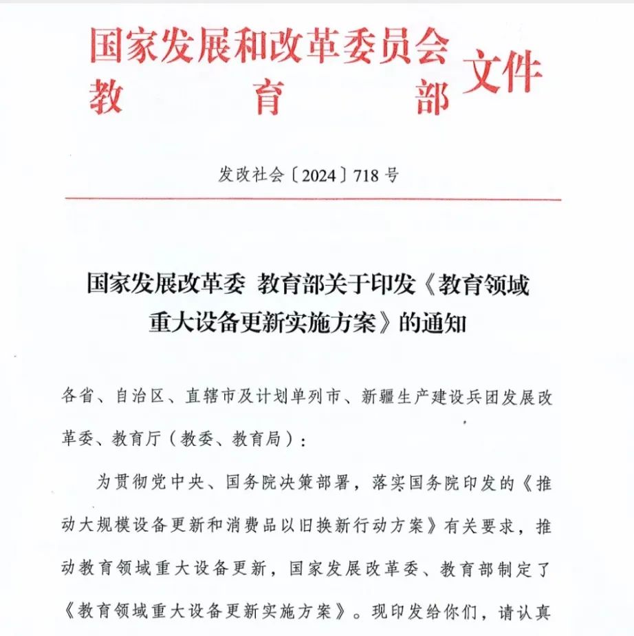 《教育領域重大設備更新實施方案》是為推動教育領域的設備現代化,提升教學和科研水平,由國家發改委和教育部聯合印發。《教育領域重大設備更新實施方案》,明確了支持內容、支持標準、遴選原則、申報要求以及保障措施。
