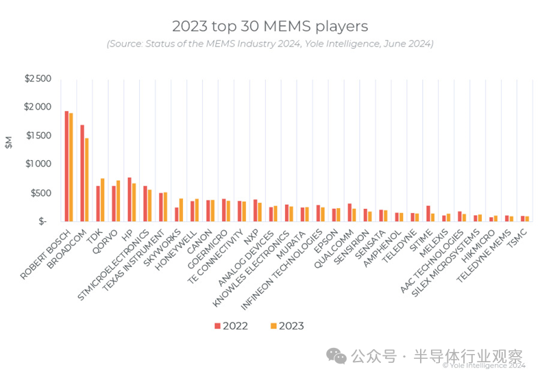 從廠商來看,博世、意法半導體和 TDK 三巨頭繼續(xù)領跑 MEMS 傳感器市場,而博通和 Qorvo 則領跑 RF MEMS 市場。博世保持相對穩(wěn)定的營收,而 TDK 的增長速度超過市場,抵消了意法半導體的下滑。博通在蘋果的 FBAR 業(yè)務中失去了很大一部分份額,而 Qorvo 憑借其 BAW SMR 奪回了一部分業(yè)務。