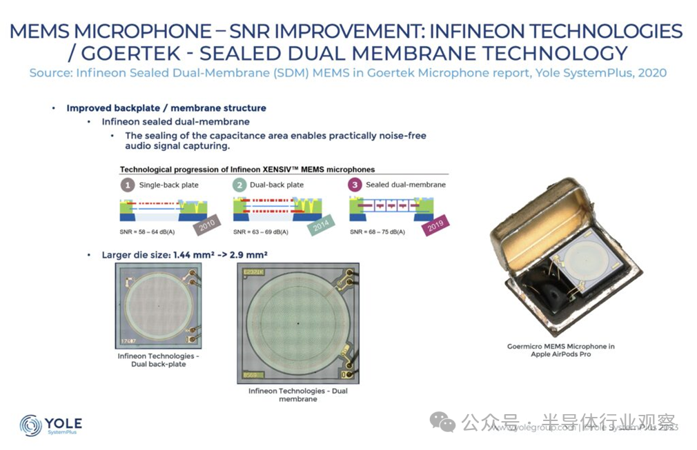 從設計和材料角度來看,MEMS 廠商正在不斷創(chuàng)新,以提高其設備的性能。例如,英飛凌科技在蘋果 Airpods Pro 的歌爾 MEMS 麥克風中采用了密封雙膜技術(shù),顯著提高了 SNR 性能。