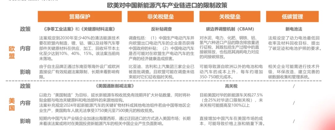歐美近年來(lái)對(duì)中國(guó)新能源汽車(chē)產(chǎn)業(yè)鏈進(jìn)口的若干限制政策摘要。霞光智庫(kù)&和君《中國(guó)新能源汽車(chē)出海十大趨勢(shì)洞察報(bào)告》,2024-5