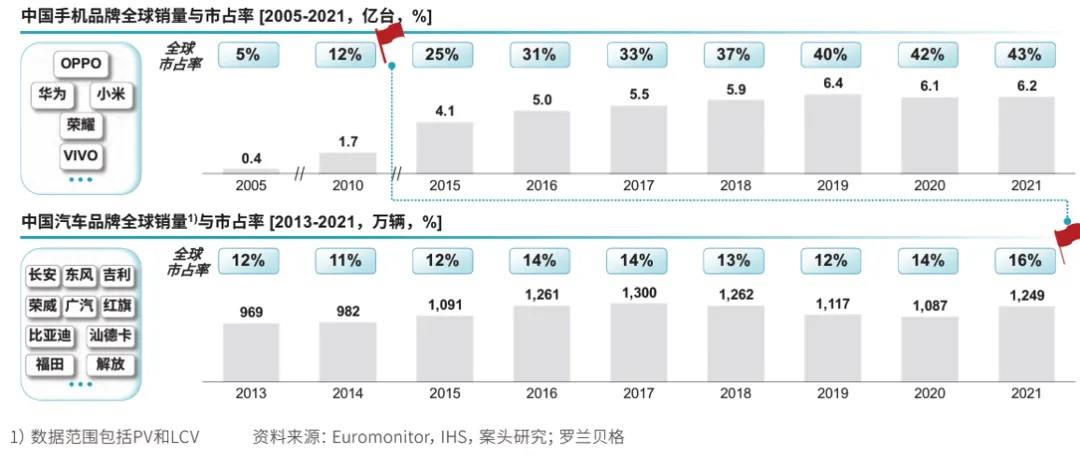 中國(guó)手機(jī)及汽車(chē)品牌發(fā)展軌跡對(duì)比。羅蘭貝格《中國(guó)車(chē)企出海白皮書(shū)》,2022-12