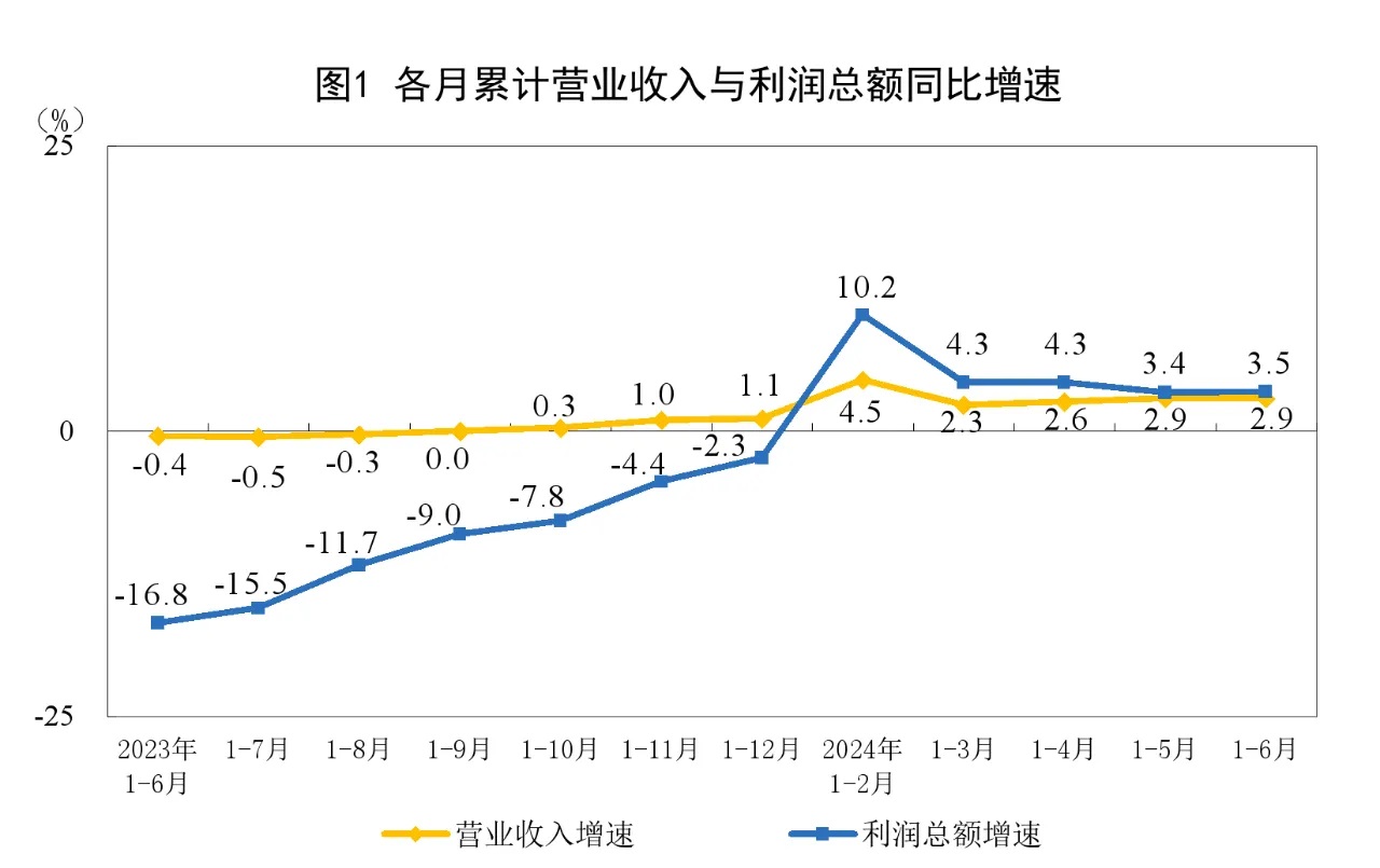 工業企業營收穩定恢復。工業生產平穩較快增長,疊加二季度以來工業品出廠價格降幅明顯收窄,共同推動企業營收穩定恢復。上半年,規上工業企業營業收入同比增長2.9%,與1—5月份持平。企業營收穩定恢復,為利潤持續增長創造有利條件。